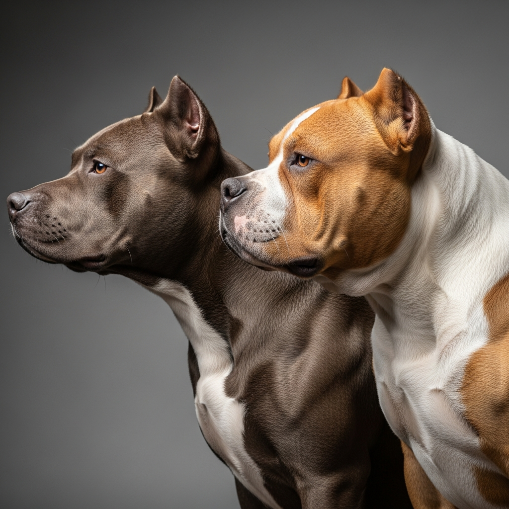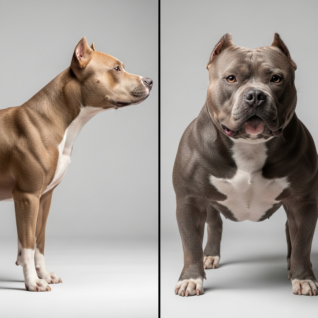 Visualmente, as diferenças são gritantes quando analisamos os padrões das raças. O American Pit Bull Terrier é um atleta de elite: ele possui uma estrutura magra, musculatura definida porém longilínea, e um peso que raramente ultrapassa os 30kg em exemplares de linhagem de trabalho. Sua agilidade é superior, sendo capaz de saltar muros altos e correr longas distâncias. Em contraste, o American Bully é o 'fisiculturista' do mundo canino. Sua estrutura é caracterizada por ossos extremamente pesados, uma caixa torácica em formato de barril muito larga e uma cabeça proporcionalmente maior em relação ao corpo. O Bully é subdividido em categorias (Pocket, Classic, Standard e XL), mas todos compartilham uma aparência de densidade muscular extrema e uma postura mais baixa e compacta que a do Pit Bull Terrier. Enquanto o APBT tem um focinho de comprimento médio e funcional, o Bully pode apresentar um focinho ligeiramente mais curto e stop mais marcado, evidenciando a influência dos Bulldogs em sua linhagem.